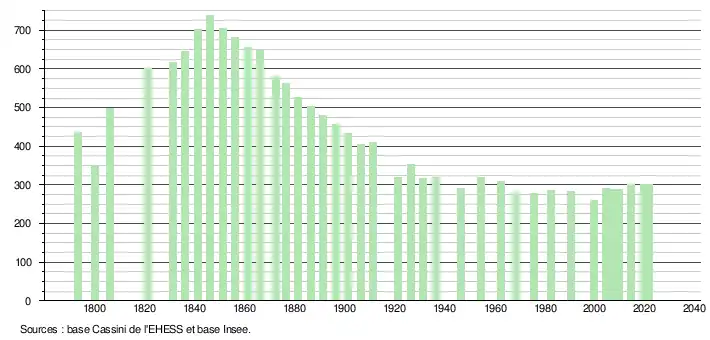 L'évolution du nombre d'habitants est connue à travers les recensements de la population effectués dans la commune depuis 1793. Pour les communes de moins de 10 000 habitants, une enquête de recensement portant sur toute la population est réalisée tous les cinq ans, les populations légales des années intermédiaires étant quant à elles estimées par interpolation ou extrapolation[15]. Pour la commune, le premier recensement exhaustif entrant dans le cadre du nouveau dispositif a été réalisé en 2004[16].