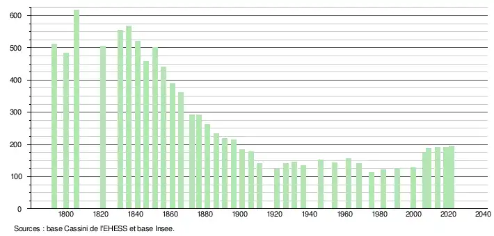 L'évolution du nombre d'habitants est connue à travers les recensements de la population effectués dans la commune depuis 1793. Pour les communes de moins de 10 000 habitants, une enquête de recensement portant sur toute la population est réalisée tous les cinq ans, les populations légales des années intermédiaires étant quant à elles estimées par interpolation ou extrapolation[21]. Pour la commune, le premier recensement exhaustif entrant dans le cadre du nouveau dispositif a été réalisé en 2008[22].