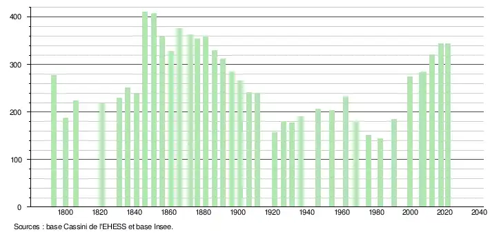 L'évolution du nombre d'habitants est connue à travers les recensements de la population effectués dans la commune depuis 1793. Pour les communes de moins de 10 000 habitants, une enquête de recensement portant sur toute la population est réalisée tous les cinq ans, les populations légales des années intermédiaires étant quant à elles estimées par interpolation ou extrapolation[18]. Pour la commune, le premier recensement exhaustif entrant dans le cadre du nouveau dispositif a été réalisé en 2007[19].