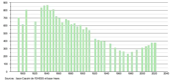 L'évolution du nombre d'habitants est connue à travers les recensements de la population effectués dans la commune depuis 1793. Pour les communes de moins de 10 000 habitants, une enquête de recensement portant sur toute la population est réalisée tous les cinq ans, les populations légales des années intermédiaires étant quant à elles estimées par interpolation ou extrapolation[22]. Pour la commune, le premier recensement exhaustif entrant dans le cadre du nouveau dispositif a été réalisé en 2005[23].