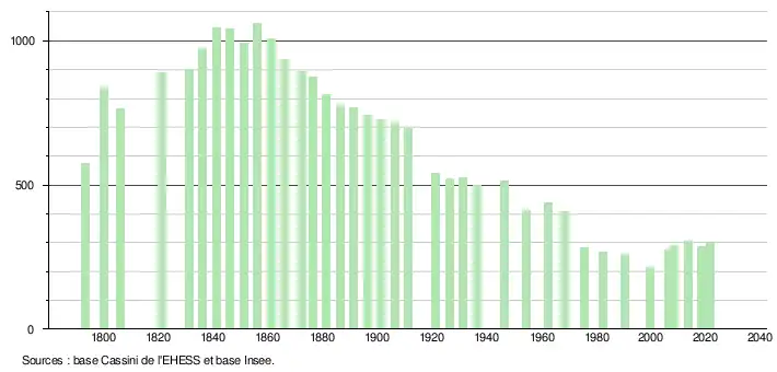 L'évolution du nombre d'habitants est connue à travers les recensements de la population effectués dans la commune depuis 1793. Pour les communes de moins de 10 000 habitants, une enquête de recensement portant sur toute la population est réalisée tous les cinq ans, les populations légales des années intermédiaires étant quant à elles estimées par interpolation ou extrapolation[15]. Pour la commune, le premier recensement exhaustif entrant dans le cadre du nouveau dispositif a été réalisé en 2008[16].
