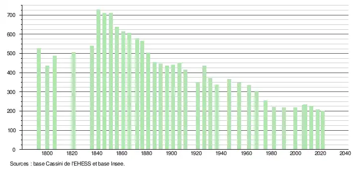 L'évolution du nombre d'habitants est connue à travers les recensements de la population effectués dans la commune depuis 1793. Pour les communes de moins de 10 000 habitants, une enquête de recensement portant sur toute la population est réalisée tous les cinq ans, les populations légales des années intermédiaires étant quant à elles estimées par interpolation ou extrapolation[20]. Pour la commune, le premier recensement exhaustif entrant dans le cadre du nouveau dispositif a été réalisé en 2007[21].