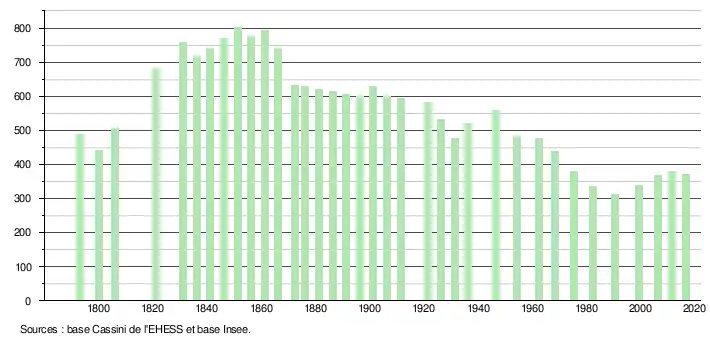 L'évolution du nombre d'habitants est connue à travers les recensements de la population effectués dans la commune depuis 1793. Pour les communes de moins de 10 000 habitants, une enquête de recensement portant sur toute la population est réalisée tous les cinq ans, les populations légales des années intermédiaires étant quant à elles estimées par interpolation ou extrapolation[4]. Pour la commune, le premier recensement exhaustif entrant dans le cadre du nouveau dispositif a été réalisé en 2006[5].