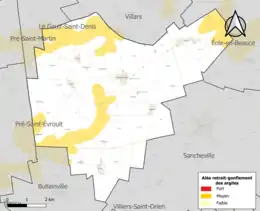 Le retrait-gonflement des sols argileux est susceptible d'engendrer des dommages importants aux bâtiments en cas d’alternance de périodes de sécheresse et de pluie. 18,2 % de la superficie communale est en aléa moyen ou fort (52,8 % au niveau départemental et 48,5 % au niveau national). Sur les 176 bâtiments dénombrés sur la commune en 2019, 0 sont en aléa moyen ou fort, soit 0 %, à comparer aux 70 % au niveau départemental et 54 % au niveau national. Une cartographie de l'exposition du territoire national au retrait gonflement des sols argileux est disponible sur le site du BRGM[18],[Carte 2].