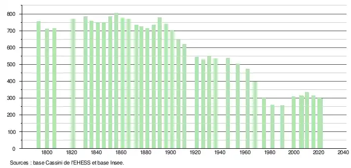 L'évolution du nombre d'habitants est connue à travers les recensements de la population effectués dans la commune depuis 1793. Pour les communes de moins de 10 000 habitants, une enquête de recensement portant sur toute la population est réalisée tous les cinq ans, les populations légales des années intermédiaires étant quant à elles estimées par interpolation ou extrapolation[23]. Pour la commune, le premier recensement exhaustif entrant dans le cadre du nouveau dispositif a été réalisé en 2005[24].
