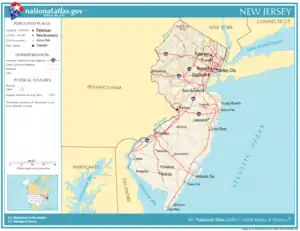 Le New Jersey (/nju.d͡ʒɛʁ.zɛ/ ; prononcé en anglais : /nuˈd͡ʒɝzi/[2] , litt. « Nouvelle-Jersey ») est un État du Nord-Est des États-Unis, bordé à l'ouest par la Pennsylvanie et le Delaware, au nord par l'État de New York et à l'est et au sud-est par l'océan Atlantique. L'État du New Jersey comprend les banlieues ouest et sud de la ville de New York. Sa capitale est Trenton et sa ville la plus peuplée est Newark.