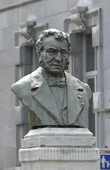 Plus tard, un monument à sa mémoire est érigé au boulevard Isabelle Brunelle, jouxtant ainsi le quartier Saint-Nicolas qui lui était cher. La construction du pont des Ardennes justifia que l'on déplace le buste qui trône aujourd'hui en face au théâtre de Namur. Il y « trône » puisque son piédestal a la forme d'un siège. C'est sur celui-ci que, chaque mois de septembre, les candidats au concours de menteries de la Société Royale Moncrabeau viennent raconter leurs « craques ».