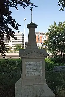 "à la mémoire des victimes de la peste de 1668 inhumés près d'ici notamment du chirurgien Nicolas Colin et de sept religieuses de l'Hôtel Dieu morts au service des pestiferés".