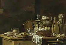 - Nature morte à la marmite, ustensiles de cuisine et poisson sur un entablement[16] ;