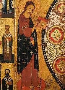 Le polé en bas de l'icône est un texte qui concerne le ktitor et dont les lettrines sont de couleur rouge, vermillon.
