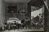 Le , il quitte sa cachette, convaincu de ne plus y être en sécurité et d'être un trop grand danger pour Mme Vernet, sa généreuse hôtesse. Il tente de fuir Paris. Il fait une halte à l'estaminet de Louis Crespinet, rue Chef-de-Ville à Clamart. Il y commande une omelette, plat réputé populaire. À la question de la servante « De combien d’œufs ? », il aurait répondu « douze »[65]. Peu crédible et jugé suspect, il est arrêté, conduit devant la sacristie de l'église Saint-Pierre-Saint-Paul où siège le comité de surveillance, puis emprisonné à Bourg de l'Égalité[Note 1], à la maison d'arrêt[Note 5].