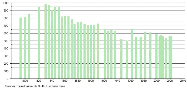 L'évolution du nombre d'habitants est connue à travers les recensements de la population effectués dans la commune depuis 1793. Pour les communes de moins de 10 000 habitants, une enquête de recensement portant sur toute la population est réalisée tous les cinq ans, les populations légales des années intermédiaires étant quant à elles estimées par interpolation ou extrapolation[19]. Pour la commune, le premier recensement exhaustif entrant dans le cadre du nouveau dispositif a été réalisé en 2004[20].