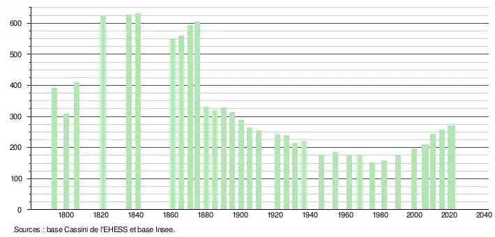 L'évolution du nombre d'habitants est connue à travers les recensements de la population effectués dans la commune depuis 1793. Pour les communes de moins de 10 000 habitants, une enquête de recensement portant sur toute la population est réalisée tous les cinq ans, les populations légales des années intermédiaires étant quant à elles estimées par interpolation ou extrapolation[20]. Pour la commune, le premier recensement exhaustif entrant dans le cadre du nouveau dispositif a été réalisé en 2005[21].