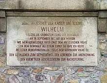 Sur le socle, on trouve l'inscription principale du monument: « ZUM ANDENKEN AN DIE EINMUETHIGE SIEGREICHE ERHEBUNG DES DEUTSCHEN VOLKES UND AN DIE WIEDERAUFRICHTUNG DES DEUTSCHEN REICHES 1870 – 1871 » (« En mémoire du soulèvement unanime et victorieux du peuple allemand et de la résurrection de l'Empire allemand 1870-1871 »). À droite et à gauche, elle est encadrée par les noms des champs de bataille importants de la guerre de 1870/71. Sur les arêtes chanfreinées de la partie supérieure du socle, on voit des feuilles de palme, qui n'étaient pas prévues à l'origine et n'ont été ajoutées qu'après la pose de la première pierre. Elles servent la mémoire des soldats tombés au combat. Cette partie de la plante, toujours verte, représente la vie éternelle et le Christianisme en a fait le symbole des martyrs.