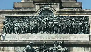 Sur le relief principal, en dessous du socle, 133 personnes sont représentées, grandeur nature. C'est ainsi le plus grand relief en bronze jamais sculpté au XIXe siècle. Au centre, le roi Guillaume de Prusse est représenté à cheval et, autour de lui, sont réunis les généraux et les princes de l'Allemagne du nord, à droite, et de l'Allemagne du sud, à gauche. Par conséquent, c'est l'atmosphère du départ pour la guerre franco-allemande que montre le relief et non la fin des événements. Sous le drapeau de la Confédération et les bannières des grandes villes d'Allemagne, Bismarck, Moltke, le prince Frédéric-Charles de Prusse, le prince héritier Albert de Saxe, Frédéric-François II de Mecklembourg-Schwerin, le général von Manteuffel, un garde prussien avec un drapeau et un fantassin saxon avec un tambour sont représentés en pied. Ils dirigent au loin leur regard déjà radieux et se rassemblent autour de leur chef, le roi Guillaume de Prusse. À la gauche de Guillaume se tiennent le prince héritier Frédéric-Guillaume de Prusse, les généraux von Blumenthal, von Hartmann, von der Tann, von Werder, un chasseur hessois et un canonnier prussien. Tous ceux qui avaient pris part à la guerre devaient pouvoir se retrouver dans l'un des représentants des différents corps d'armée. De ce fait, parmi les personnages, on trouve des représentations aussi bien des chefs de l'armée que de leurs troupes et de leurs unités.