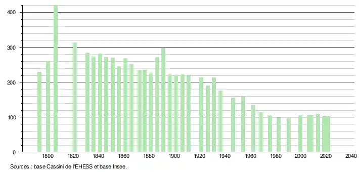 L'évolution du nombre d'habitants est connue à travers les recensements de la population effectués dans la commune depuis 1793. Pour les communes de moins de 10 000 habitants, une enquête de recensement portant sur toute la population est réalisée tous les cinq ans, les populations légales des années intermédiaires étant quant à elles estimées par interpolation ou extrapolation[12]. Pour la commune, le premier recensement exhaustif entrant dans le cadre du nouveau dispositif a été réalisé en 2008[13].