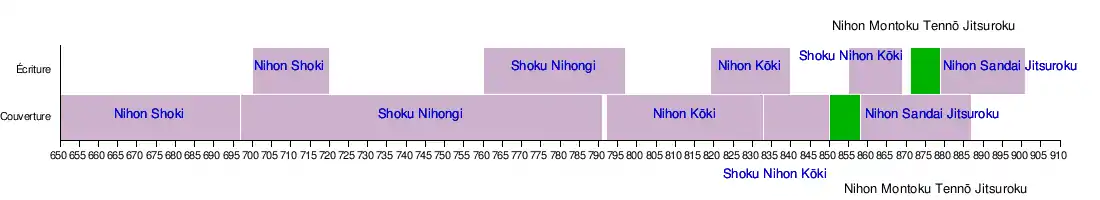 À la suite du précédent manuel d'histoire nationale Shoku nihon kōki en 869, l'empereur Seiwa ordonne en 871 la compilation des années écoulées depuis. L'ouvrage est principalement édité par Fujiwara no Mototsune avec l'aide de Minabuchi no Toshina, Ōe Otondo, Shimada no Tadaomi, Sugawara no Koreyoshi, Yoshibuchi no Yoshinari et d'importantes contributions de Miyako no Yoshika[1]. Le texte est achevé en 879.