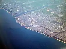 Dans le sens de lecture : La tour NEXT21, le pont Bandai, le Toki Messe, le stade Denka, le centre-ville de Niigata et le fleuve Shinano, la Rainbow Tower | ||||