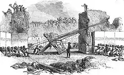 Illustrations des ouvrages relatant les découvertes de Layard à Nimroud : découverte d'une statue colossale, et déplacement d'une autre en vue de son transfert. | ||