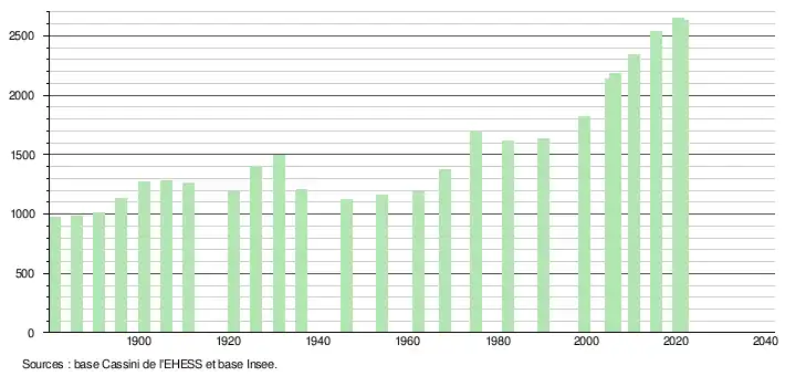 - Population municipale légale en vigueur au 1er janvier 2024, millésimée 2021, définie dans les limites territoriales en vigueur au 1er janvier 2023, date de référence statistique : 1er janvier 2021.