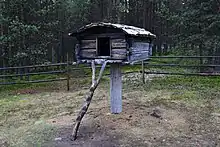 Un autre type de hangar de stockage sami, appelé ájtte (aihte), était disposé à une hauteur plus basse et reposait sur quatre poteaux de bois[1]. Il est appelé buvrie[2] par les Sami du sud.