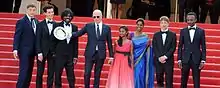 (de gauche à droite, Thomas Bidegain, Noé Debré, Antonythasan Jesuthasan, Jacques Audiard, Claudine Vinasithamby, Kalieaswari Srinivasan, Vincent Rottiers, Marc Zinga).