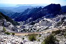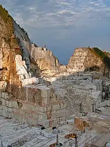 Les carrières de pierre des Alpes Apuanes étaient probablement déjà exploitées à l'âge du fer, mais l'activité minière proprement dite se développa à partir de l'époque romaine. Des carrières les plus anciennes, il ne reste pas grand-chose, puisque l'activité minière qui s'est poursuivie au cours des siècles a provoqué leur destruction progressive. En revanche, les carrières de La Tagliata (Miseglia) et de Fossacava (Colonnata) [61] sont encore intactes, bien que peu valorisées d'un point de vue historico-archéologique et touristique [62]. Une autre carrière d'origine certainement ancienne est la carrière dite romaine de Forno (Massa), objet de contentieux judiciaires pour atteintes à l'environnement [63] et dont la compatibilité environnementale n'a pas été renouvelée en 2017 [64].
