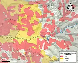 La commune est vulnérable au risque de mouvements de terrains constitué principalement du retrait-gonflement des sols argileux[27]. Cet aléa est susceptible d'engendrer des dommages importants aux bâtiments en cas d’alternance de périodes de sécheresse et de pluie. 71,6 % de la superficie communale est en aléa moyen ou fort (76,3 % au niveau départemental et 48,5 % au niveau national). Sur les 449 bâtiments dénombrés sur la commune en 2019, 366 sont en aléa moyen ou fort, soit 82 %, à comparer aux 90 % au niveau départemental et 54 % au niveau national. Une cartographie de l'exposition du territoire national au retrait gonflement des sols argileux est disponible sur le site du BRGM[28],[Carte 3].