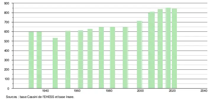 | L'évolution du nombre d'habitants est connue à travers les recensements de la population effectués dans la commune depuis 1931. Pour les communes de moins de 10 000 habitants, une enquête de recensement portant sur toute la population est réalisée tous les cinq ans, les populations légales des années intermédiaires étant quant à elles estimées par interpolation ou extrapolation[33]. Pour la commune, le premier recensement exhaustif entrant dans le cadre du nouveau dispositif a été réalisé en 2007[34]. En 2021, la commune comptait 843 habitants[Note 6], en diminution de 2,43 % par rapport à 2015 (Tarn : +1,82 %, France hors Mayotte : +1,84 %). |