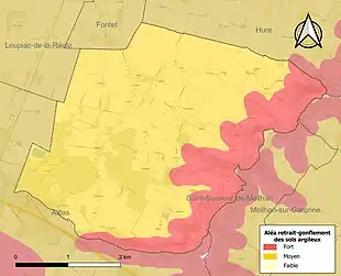 Le retrait-gonflement des sols argileux est susceptible d'engendrer des dommages importants aux bâtiments en cas d’alternance de périodes de sécheresse et de pluie. La totalité de la commune est en aléa moyen ou fort (67,4 % au niveau départemental et 48,5 % au niveau national). Sur les 205 bâtiments dénombrés sur la commune en 2019, 205 sont en aléa moyen ou fort, soit 100 %, à comparer aux 84 % au niveau départemental et 54 % au niveau national. Une cartographie de l'exposition du territoire national au retrait gonflement des sols argileux est disponible sur le site du BRGM[19],[Carte 2].