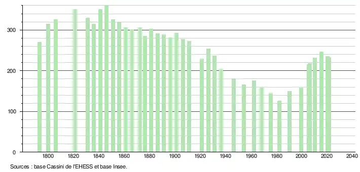 L'évolution du nombre d'habitants est connue à travers les recensements de la population effectués dans la commune depuis 1793. Pour les communes de moins de 10 000 habitants, une enquête de recensement portant sur toute la population est réalisée tous les cinq ans, les populations légales des années intermédiaires étant quant à elles estimées par interpolation ou extrapolation[26]. Pour la commune, le premier recensement exhaustif entrant dans le cadre du nouveau dispositif a été réalisé en 2005[27].