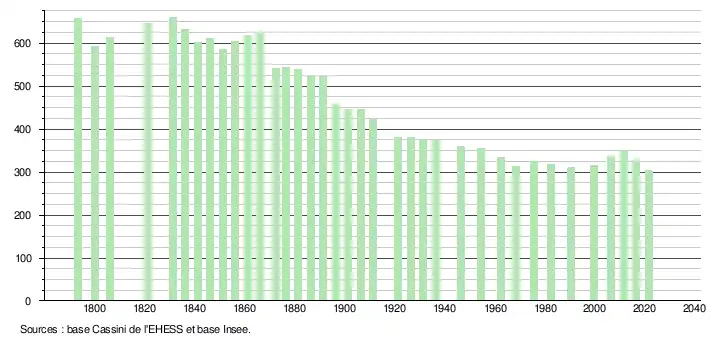 L'évolution du nombre d'habitants est connue à travers les recensements de la population effectués dans la commune depuis 1793. Pour les communes de moins de 10 000 habitants, une enquête de recensement portant sur toute la population est réalisée tous les cinq ans, les populations légales des années intermédiaires étant quant à elles estimées par interpolation ou extrapolation[17]. Pour la commune, le premier recensement exhaustif entrant dans le cadre du nouveau dispositif a été réalisé en 2006[18].