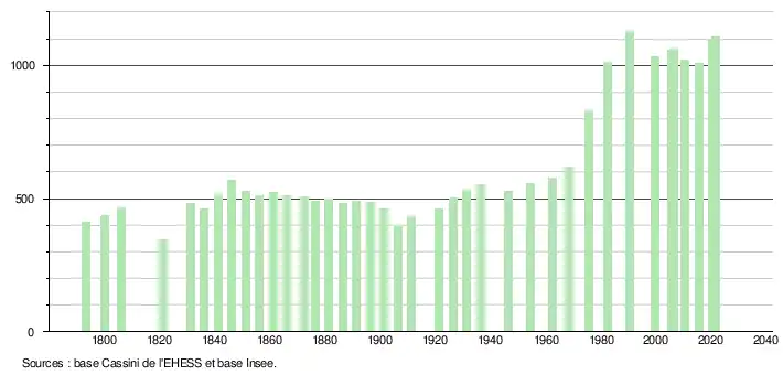 L'évolution du nombre d'habitants est connue à travers les recensements de la population effectués dans la commune depuis 1793. Pour les communes de moins de 10 000 habitants, une enquête de recensement portant sur toute la population est réalisée tous les cinq ans, les populations légales des années intermédiaires étant quant à elles estimées par interpolation ou extrapolation[26]. Pour la commune, le premier recensement exhaustif entrant dans le cadre du nouveau dispositif a été réalisé en 2005[27].