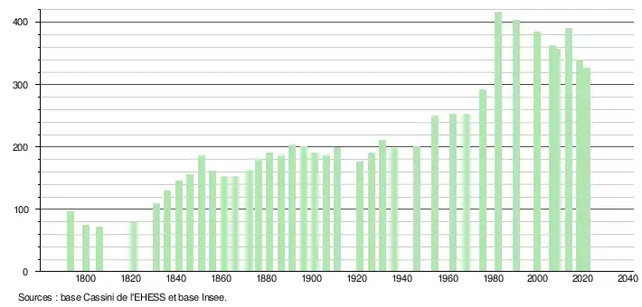 L'évolution du nombre d'habitants est connue à travers les recensements de la population effectués dans la commune depuis 1793. Pour les communes de moins de 10 000 habitants, une enquête de recensement portant sur toute la population est réalisée tous les cinq ans, les populations légales des années intermédiaires étant quant à elles estimées par interpolation ou extrapolation[17]. Pour la commune, le premier recensement exhaustif entrant dans le cadre du nouveau dispositif a été réalisé en 2008[18].