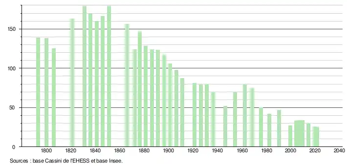 L'évolution du nombre d'habitants est connue à travers les recensements de la population effectués dans la commune depuis 1793. Pour les communes de moins de 10 000 habitants, une enquête de recensement portant sur toute la population est réalisée tous les cinq ans, les populations légales des années intermédiaires étant quant à elles estimées par interpolation ou extrapolation[18]. Pour la commune, le premier recensement exhaustif entrant dans le cadre du nouveau dispositif a été réalisé en 2004[19].