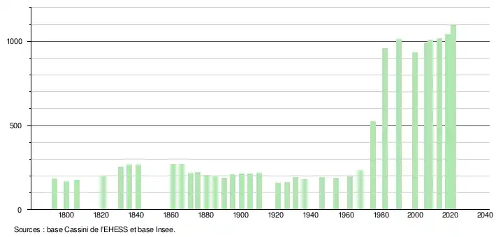 On dénombrait 36 foyers en 1789[18]. L'évolution du nombre d'habitants est connue à travers les recensements de la population effectués dans la commune depuis 1793. Pour les communes de moins de 10 000 habitants, une enquête de recensement portant sur toute la population est réalisée tous les cinq ans, les populations légales des années intermédiaires étant quant à elles estimées par interpolation ou extrapolation[19]. Pour la commune, le premier recensement exhaustif entrant dans le cadre du nouveau dispositif a été réalisé en 2008[20].