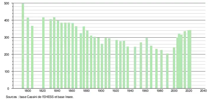 L'évolution du nombre d'habitants est connue à travers les recensements de la population effectués dans la commune depuis 1793. Pour les communes de moins de 10 000 habitants, une enquête de recensement portant sur toute la population est réalisée tous les cinq ans, les populations légales des années intermédiaires étant quant à elles estimées par interpolation ou extrapolation[21]. Pour la commune, le premier recensement exhaustif entrant dans le cadre du nouveau dispositif a été réalisé en 2004[22].