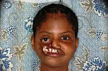 - une malnutrition sévère : elle semblerait être le facteur de risque le plus important de survenue du noma[11] ;