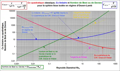 Sur ce graphe, le Cx linéaire (courbe bleue) est défini comme le quotient de la force motrice F par le produit µ V D, µ étant la viscosité dynamique du fluide et V la vitesse de la particule, comme précédemment ; par définition, le Cx linéaire des corps est constant en régime de Stokes (pour la sphère, c’est 3π en référence au diamètre D) (voir Écoulement de Stokes).
