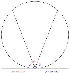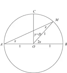 - Dans un autre exercice, il demande de partager un quart de disque en deux parties de même aire par un segment perpendiculaire à un côté[2]. Avec les notations de la figure de droite, l'équation s'écrit . Posant , elle devient , ce qui donne .