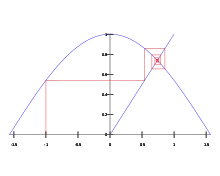 - L'unique solution entre 0 et de a pour valeur approchée 0,86033359, voir la suite A069855 de l'OEIS, mais ce point fixe n'est pas attractif. Il l'est par contre pour la fonction .