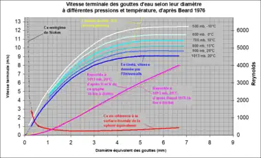 Dans cette égalité, 1,225 est la masse volumique de l'air au niveau de la mer en kg/m3, 9,1 m/s est la vitesse des plus grosses gouttes à ce même niveau et 0,005 5 m est le diamètre équivalent des plus grosses gouttes également à ce même niveau, valeurs données par ce graphe.