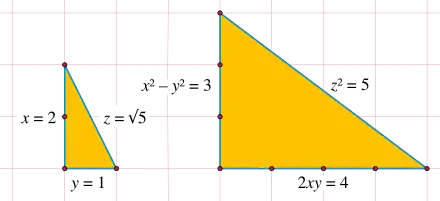 Si un entier (non nécessairement premier) est somme de deux carrés alors son carré l'est aussi. Plus généralement, si deux entiers sont sommes de deux carrés, alors leur produit est aussi somme de deux carrés, d'après l'identité de Diophante[6]. Une interprétation de cette identité remarquable met en jeu les entiers de Gauss (les nombres complexes dont la partie réelle et la partie imaginaire sont deux entiers relatifs). La norme d'un entier de Gauss est l'entier . Ainsi, l'ensemble des sommes de deux carrés coïncide avec l'ensemble des normes d'entiers de Gauss, qui est stable par produits.