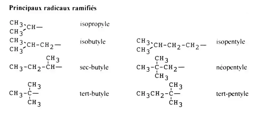Principaux radicaux ramifiés