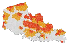 En orange, les communes monopolarisées et en rouge les pôles urbains.