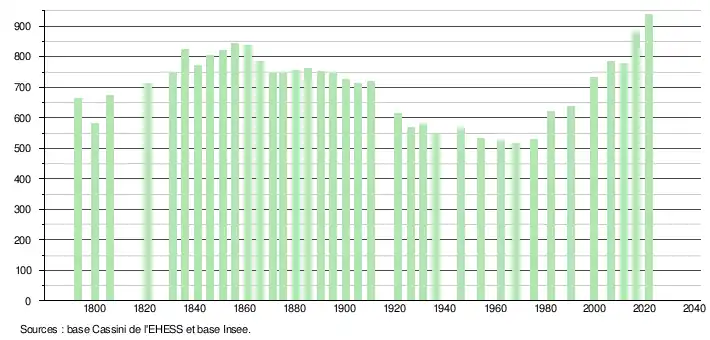L'évolution du nombre d'habitants est connue à travers les recensements de la population effectués dans la commune depuis 1793. Pour les communes de moins de 10 000 habitants, une enquête de recensement portant sur toute la population est réalisée tous les cinq ans, les populations légales des années intermédiaires étant quant à elles estimées par interpolation ou extrapolation[16]. Pour la commune, le premier recensement exhaustif entrant dans le cadre du nouveau dispositif a été réalisé en 2006[17].