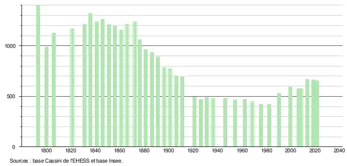 L'évolution du nombre d'habitants est connue à travers les recensements de la population effectués dans la commune depuis 1793. Pour les communes de moins de 10 000 habitants, une enquête de recensement portant sur toute la population est réalisée tous les cinq ans, les populations légales des années intermédiaires étant quant à elles estimées par interpolation ou extrapolation[18]. Pour la commune, le premier recensement exhaustif entrant dans le cadre du nouveau dispositif a été réalisé en 2008[19].