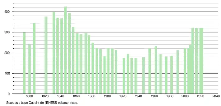 L'évolution du nombre d'habitants est connue à travers les recensements de la population effectués dans la commune depuis 1793. Pour les communes de moins de 10 000 habitants, une enquête de recensement portant sur toute la population est réalisée tous les cinq ans, les populations légales des années intermédiaires étant quant à elles estimées par interpolation ou extrapolation[20]. Pour la commune, le premier recensement exhaustif entrant dans le cadre du nouveau dispositif a été réalisé en 2004[21].