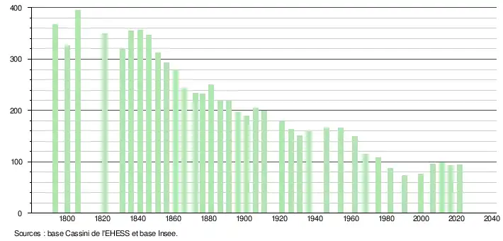L'évolution du nombre d'habitants est connue à travers les recensements de la population effectués dans la commune depuis 1793. Pour les communes de moins de 10 000 habitants, une enquête de recensement portant sur toute la population est réalisée tous les cinq ans, les populations légales des années intermédiaires étant quant à elles estimées par interpolation ou extrapolation[23]. Pour la commune, le premier recensement exhaustif entrant dans le cadre du nouveau dispositif a été réalisé en 2006[24].