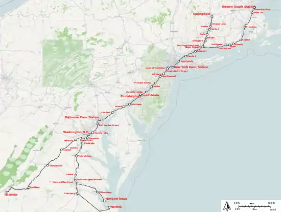 Le Northeast Regional circule tous les jours. La durée moyenne de trajet entre Boston à New York est de 4 heures, entre Boston à Lynchburg de 12 heures.